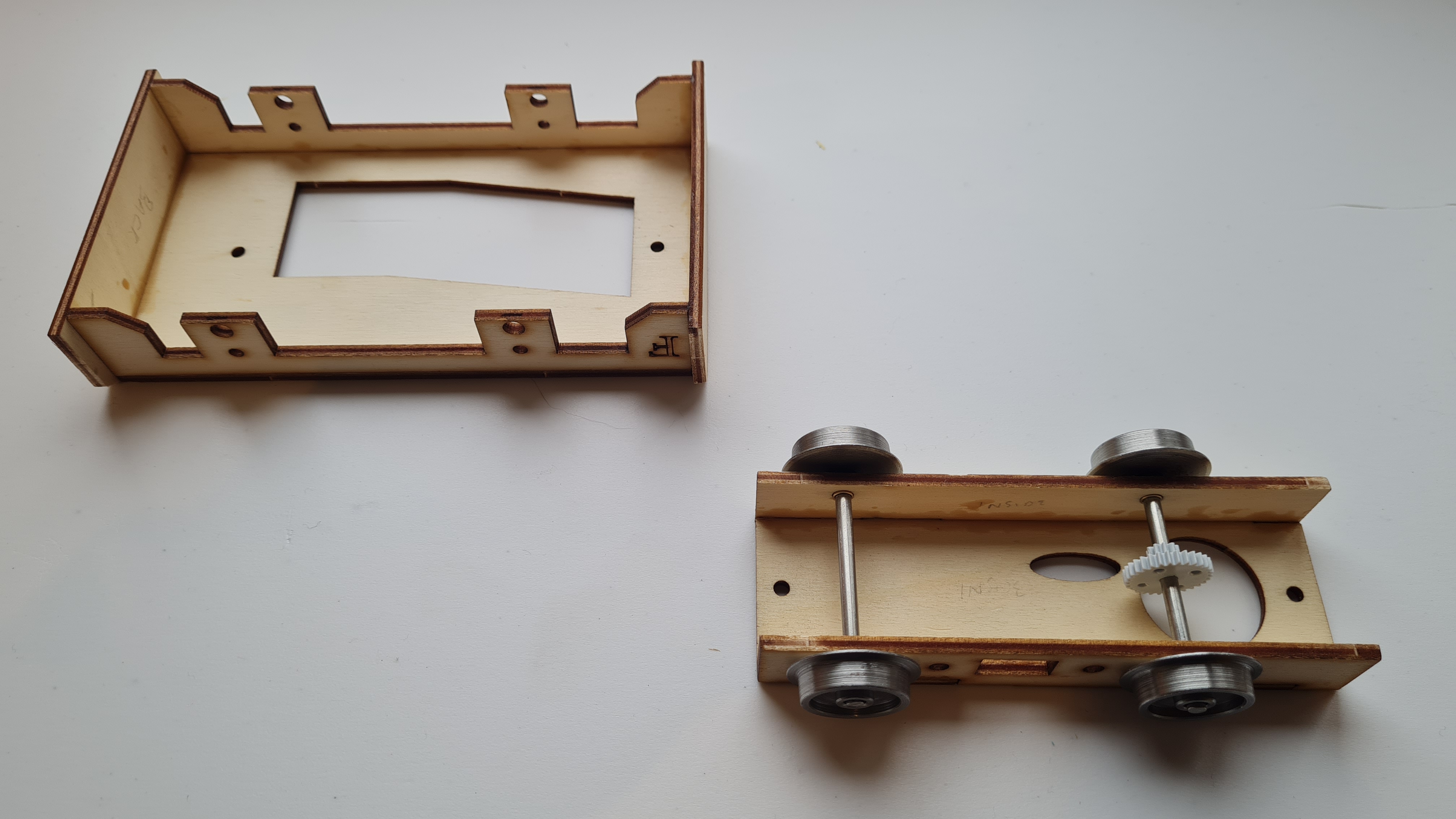 Next the basic rolling chassis was constructed, together with the central gear for the motor.